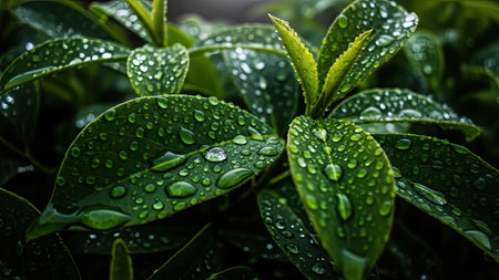 A close-up shot capturing fresh green leaves adorned with glimmering water droplets, creating a serene and vibrant atmosphere ideal for nature lovers and enthusiasts.
