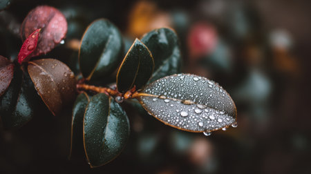 A macro shot of fresh raindrops on lush dark green foliage with a hint of orange leaves in the background. A moody and tranquil nature scene during a rainy day.