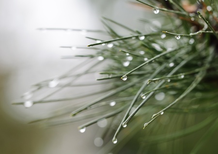 Raindrops on coniferous branches close-up. Soft focus, low key. Atmospheric natural photography.