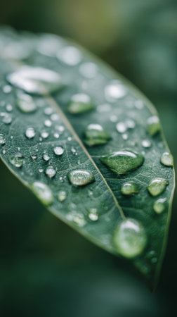 This image showcases exquisite water droplets resting on a lush green leaf, highlighting the beauty of nature. Perfect for themes related to freshness and ecology.