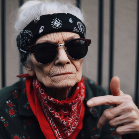 Portrait of an elderly woman in a red scarf and sunglasses.