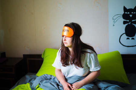 A tired and sleepy girl woke up early in the morning to work and did not get enough sleep, with a blindfold for sleep and did not want to go to work.