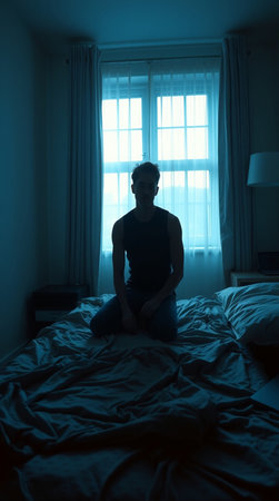 A youth lies in bed, gazing at the blank ceiling, their face reflecting emptiness and despair. The dimly lit room adds to their sense of isolation.