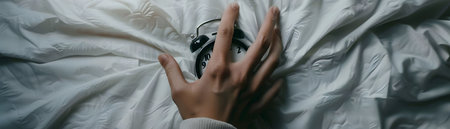 Hand reaching out from under the warm cozy covers to hit the snooze button on an alarm clock signifying a slow relatable start to a lazy Monday morning routine