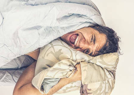 Man lying on white bed, open wide mouth in room alone at apartment.