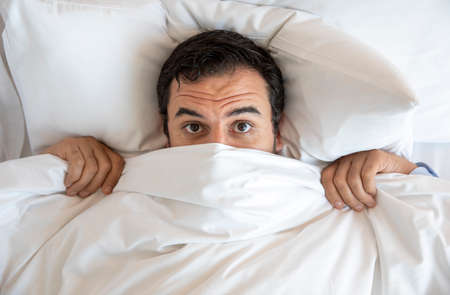 Yawning man awake late at night in bed, can not fall asleep. Sleepy tired, sleep disorder, insomnia and sleeplessness