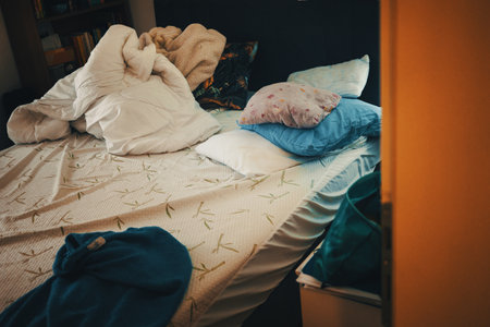 An unmade bed in a small bedroom, a scene from ordinary life.