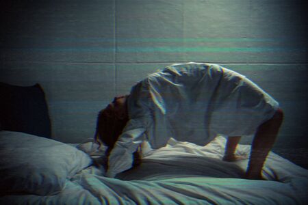 creepy girl in nightgown standing on legs and arms on bed with tv noise