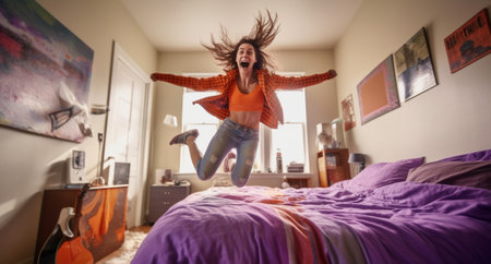 A cozy bedroom scene with vibrant geometric art, patterned pillows, a stylish lamp, and a touch of greenery creating a perfect relaxing ambiance. Generated A.I.