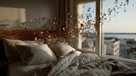 A cozy bedroom scene featuring sunlight streaming through a window, with floating music notes creating a serene and peaceful atmosphere in a city setting.