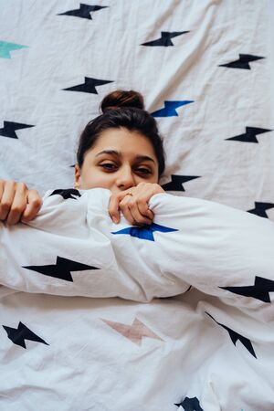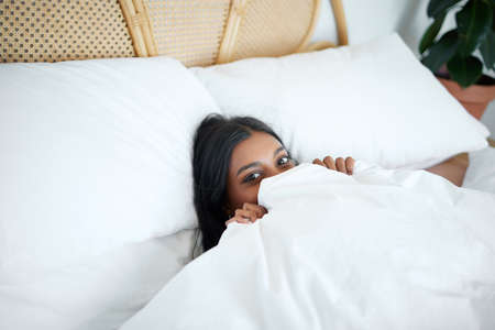 Dont tell anyone that Im here. Shot of a young woman peeking from under her duvet while lying in her bed.