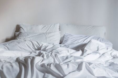 White bed sheets rumpled and messy under cloudy diffused light. Wide angle shot with visible thread count and negative space.