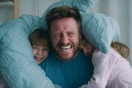A father shares a fun and laughter-filled moment with his two smiling children. They are surrounded by fluffy pillows in a cozy living room, enjoying their time together.