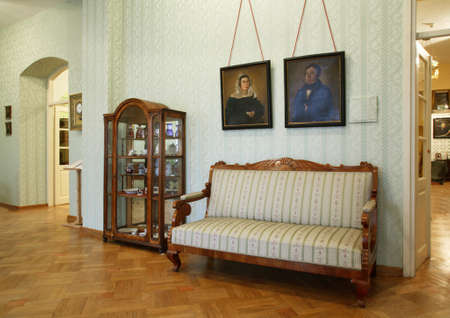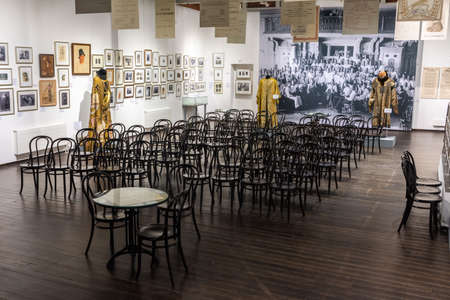 Moscow, Russia – July 8, 2017. Interior view of Bakhrushin Theatre Museum in Moscow. View with chairs and exhibits.