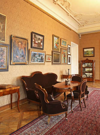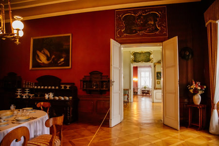 Litomysl, Czech Republic, 17 April 2022: castle chateau baroque representative interior with baroque classic furniture, vintage framed photographs on the table, porcelain figurines