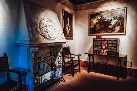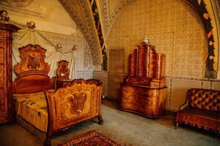 BOJNICE, SLOVAKIA - 25.08.2018: Bojnice medieval castle interior, UNESCO heritage, Slovakia. Romantic castle with gothic and Renaissance elements built in 12th century. Interior equipment and rooms.