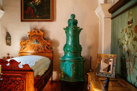 Cervena Lhota, South Bohemia, Czech Republic, 9 October 2021: Castle interior, priest's bedroom, wood carved bed with divine eye and green ceramic tiled stove, mirror in painted frame