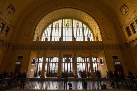 PRAGUE, CZECHIA - OCTOBER 31, 2019: Historical hall of Praha Hlavni Nadrazi train station, in Prague, with passengers passing and waiting. It is a landmark of Art Nouveau in the city.