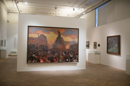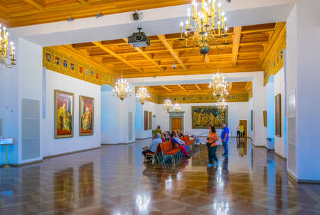 Moscow, Russia – July 7, 2017. Interior view of the New Tretyakov Gallery in Moscow. View of an exhibition hall with people and artwork.