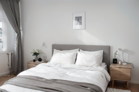 Urban Contemporary Modern Scandinavian Bedroom Interior Design. Gray and White wall. .