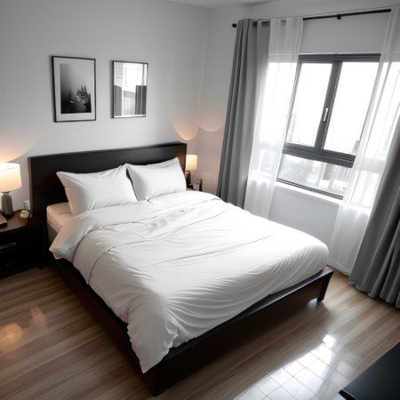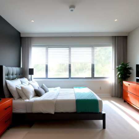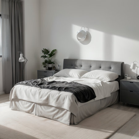 Modern bedroom interior featuring a comfortable bed, decorative pillows, bedside tables, and green houseplants