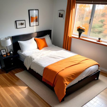 Cozy bedroom setting featuring a bed with yellow and blue pillows, a textured carpet, and a contemporary side table lamp, creating a warm, inviting atmosphere