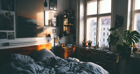 A cozy bedroom bathed in golden light, with art, plants, and a rumpled bed
