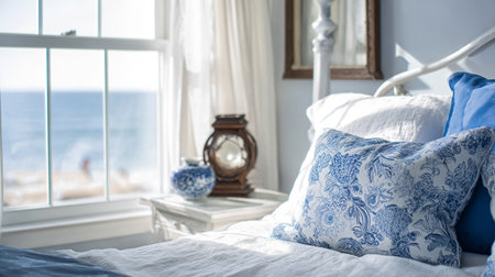 Bedroom interior with coastal decor, white bedding and blue pillows, morning light streaming through window overlooking ocean view