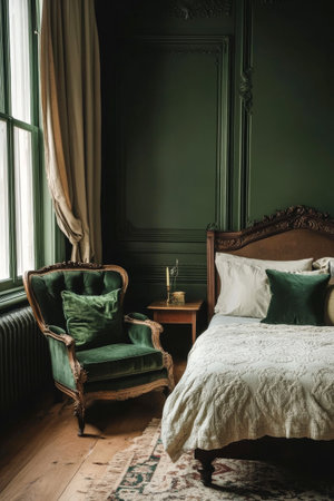 A serene bedroom features a rich green color scheme, vintage furniture, and warm natural light streaming through large windows, creating a peaceful atmosphere for relaxation.