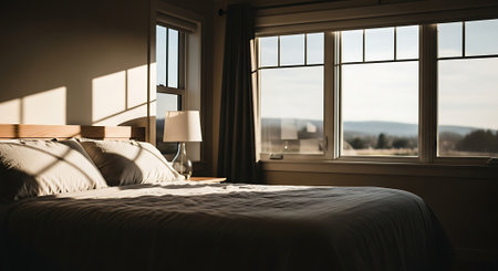 This cozy modern bedroom features a comfortable bed, soft pillows, and large windows offering a stunning view at sunset, creating a serene and inviting atmosphere.