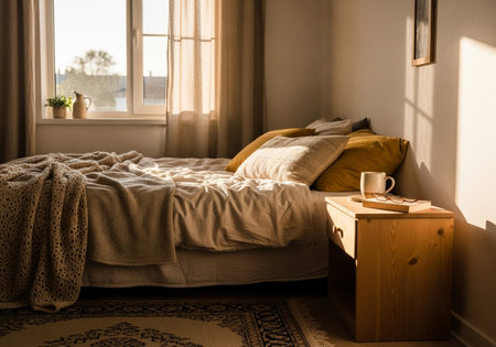 A serene bedroom scene featuring a bed bathed in soft morning light, complete with a bedside table, mug, and book, creating a cozy and inviting atmosphere for relaxation.