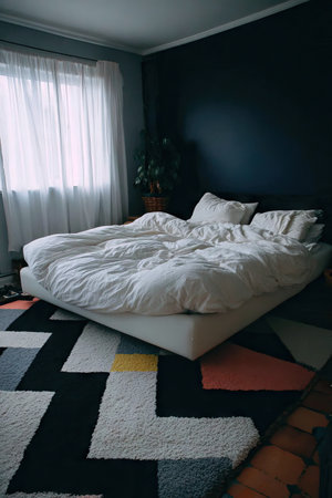 An interior shot showcases a bed with white bedding and pillows. The scene is illuminated by soft light from a window covered by sheer curtains. A colorful geometric rug is in the foreground. The image could be suitable for lifestyle, home decor, or interior design purposes.
