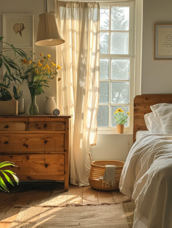 A serene bedroom filled with natural light creates a cozy atmosphere, showcasing soft bedding and elegant wooden furniture for a peaceful retreat.