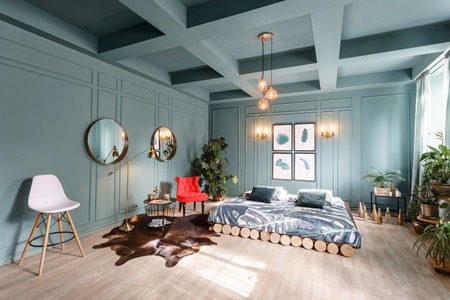 Morning interior in bedroom hotel. Bright and clean interior design of a modern room with bed, chair and houseplant. Mirrors on walls
