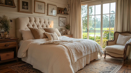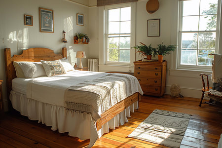 American farmhouse bedroom with warm morning sunlight casting soft shadows, captured from an eye-level, diagonal perspective to emphasize the rustic charm.