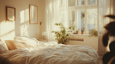 A cozy bedroom bathed in warm sunlight, featuring various plants and soft decor elements. Ideal for showcasing a peaceful living space and natural beauty.