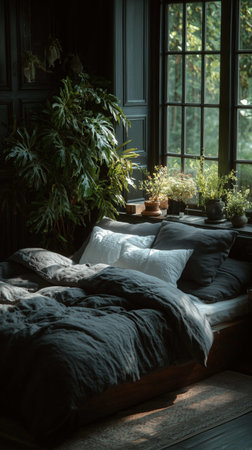 A tranquil bedroom features a dark color palette with a spacious bed adorned in gray lines. Sunlight streams through large windows, illuminating indoor plants.