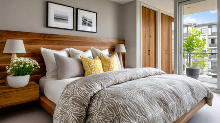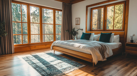A serene and stylish bedroom featuring large windows that bring in natural light, wooden furniture, and cozy textiles, perfect for relaxation and tranquility.