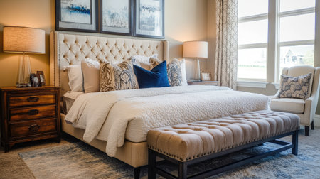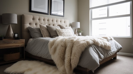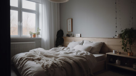 Cozy bedroom with natural light illuminating soft textiles and elegant decor, creating a serene retreat in a peaceful home setting. Generative AI