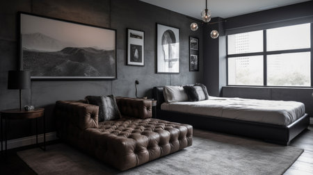Bedroom decor, home interior design . Modern Industrial style with Statement Lighting decorated with Concrete and Leather material . Generative AI AIG26.