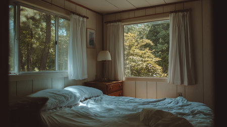 Cozy bedroom soft light white curtain open window unmade bed wood panel serene summer calm view of trees outside