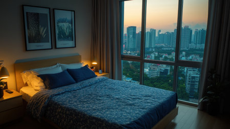 A serene bedroom with a comfortable bed and stunning city skyline view at sunset, perfect for creating a relaxing atmosphere in a modern home setting.