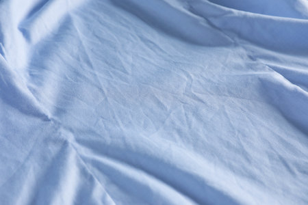 Crumpled light blue fabric as background, closeup view