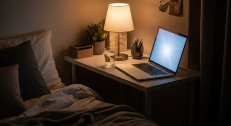 A cozy bedroom scene at night featuring a laptop illuminating the room, a warm lamp, a glass of water, and a comfortable bed, creating a relaxing ambiance.