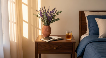 Cozy bedroom interior with a dark wood nightstand, featuring a vase of lavender and eucalyptus, an open book, and a glass of iced tea. Sunlight streams through a window, casting warm shadows.
