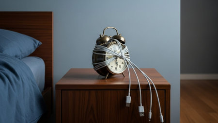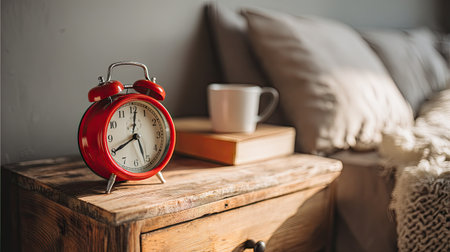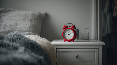 A cozy bedroom scene showcasing a vibrant red alarm clock on a nightstand beside a soft pillow and a plush blanket, creating a warm and inviting atmosphere for relaxation.