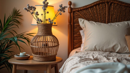 Cozy bedroom with wicker decor and warm lighting. That the image is generated using AI.