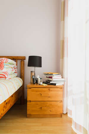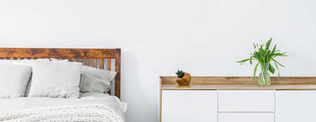 Close-up of a part of wooden bed with linen and pillows and a side cabinet with fresh cut flowers in a vase on top standing against a white wall in a bright bedroom interior. Panorama. Real photo.