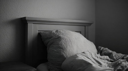 A dimly lit bedroom with an unmade bed, an empty coffee cup on the nightstand, and soft shadows creating a sense of stillness