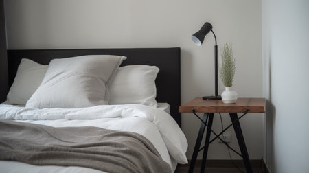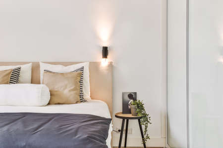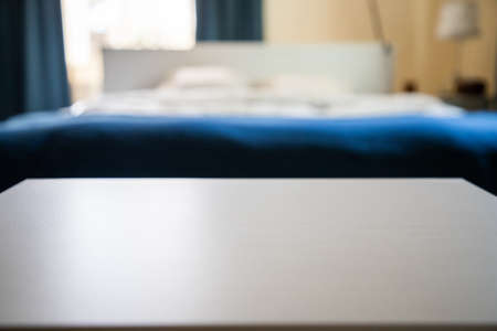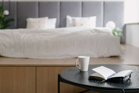 Home bedroom interior, white bed decor. Cozy room with scandinavian design, closeup at coffee table near white bed. Furniture for comfortable relaxation, apartment with wooden object.